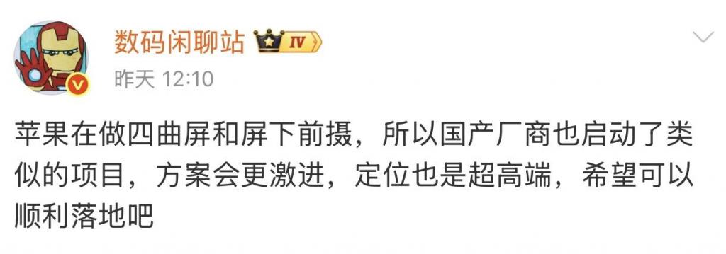 现在知名爆料博主数码闲聊站表示苹果在做四曲屏和屏下前摄,并且有国产厂商也启动了类似的项目,定位超高端。