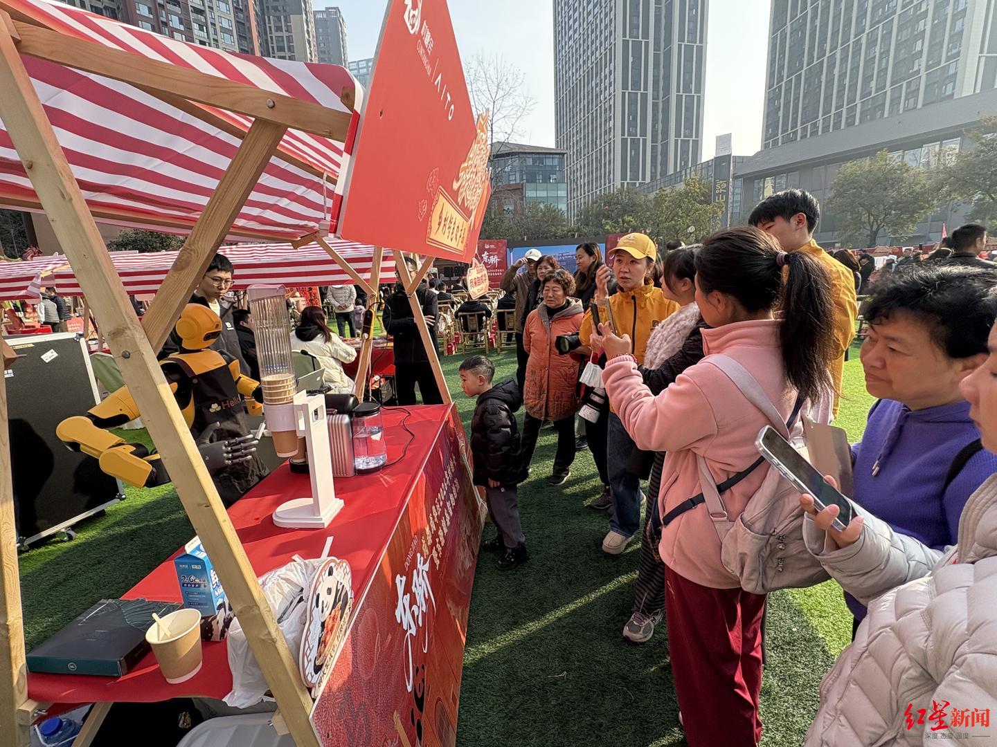 “我们为游客、市民准备了4种不同口味的咖啡。机器人通过颜色识别咖啡品类,邀请市民品尝。”跨维智蜀(成都)机器人有限责任公司副总经理杨智杰介绍,在成华区东郊记忆点位,春节假期前一天,“咖啡机器人就已为游客们制作上千杯咖啡,让大家提前感受马年春节的热闹氛围,其中拿铁口味备受大家偏爱”。