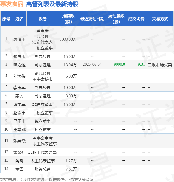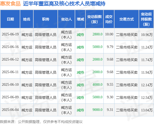 惠发食品近半年内的董监高及核心技术人员增减持详情如下: